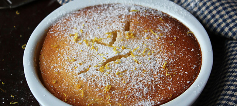 Cream butter and sugar. Add egg yolks, flour, grated rind and juice. Mix well after each addition. Add milk slowly. Whisk egg whites till stiff and fold into mixture. Bake in a buttered dish, standing in a pan of water, at 180C for approximately 40 mins or until top springs back when lightly pressed with finger.